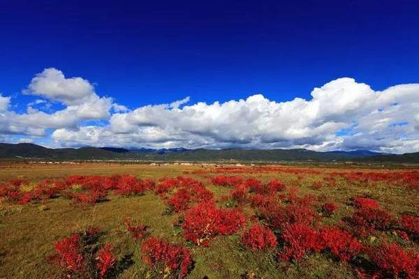 中甸位于云南省迪慶藏族自治州。這里有廣闊而美麗的草原,生長(zhǎng)著滿山的莨茗紅葉,色彩濃艷夸張。而被紅浪所包圍的藏民村莊、田野,則顯得非常樸素和安詳。